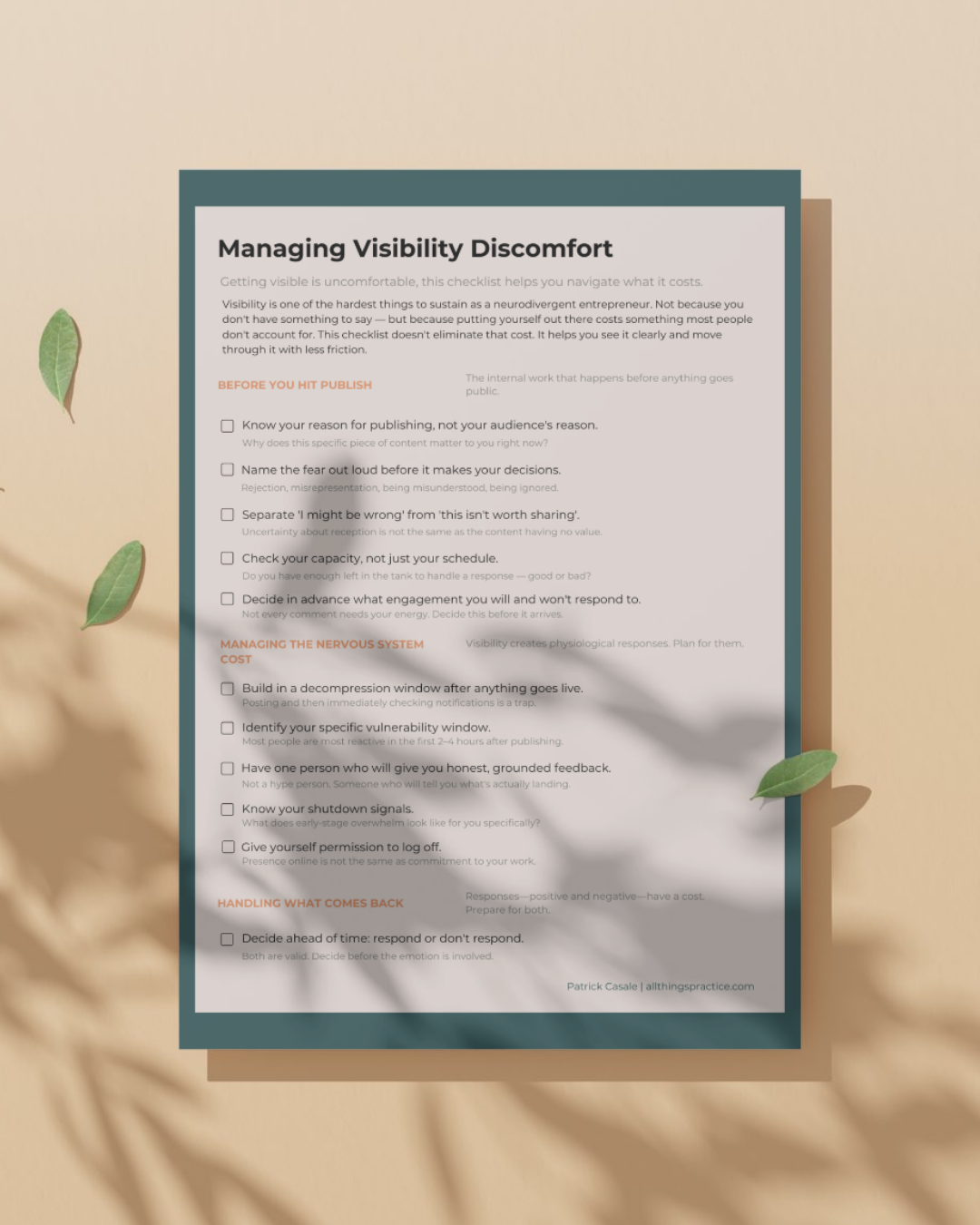 Visibility is one of the hardest things to sustain as a neurodivergent entrepreneur. Not because you don't have something to say โ but because putting yourself out there costs something most people don't account for. This checklist doesn't eliminate that cost. It helps you see it clearly and move through it with less friction.